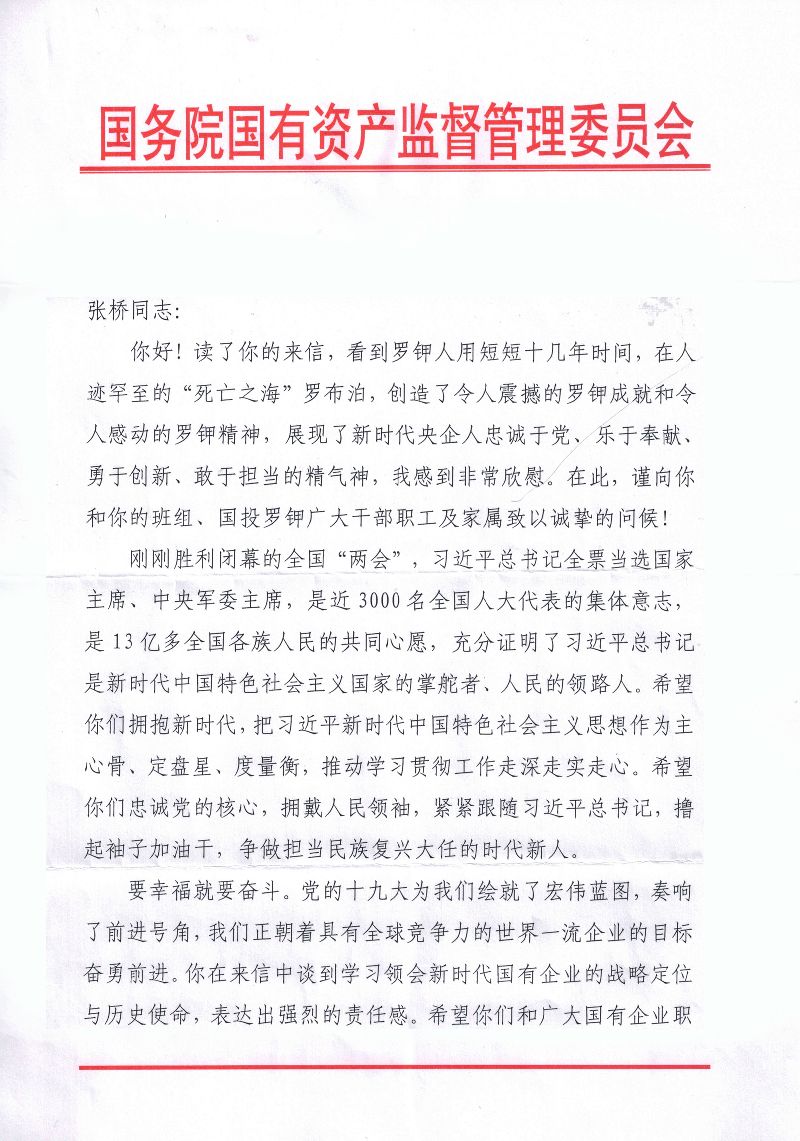 我是國投新疆羅布泊鉀鹽有限責任公司的一名普通的85后員工。前幾天,通過“國資小新”微信看到了您在接受《求是》雜志專訪的《新時代國有企業的戰略定位與歷史使命》文章,受益匪淺。您的思考,通篇貫徹著習近平新時代中國特色社會主義思想,為我們講述了新時代國有企業的戰略定位、歷史使命和改革發展的新目標新舉措,不僅解開了我們基層員工的一些思想困惑,也指明了我們國企未來的發展方向。所以,就想通過寫信的方式和您交流一下學習心得。