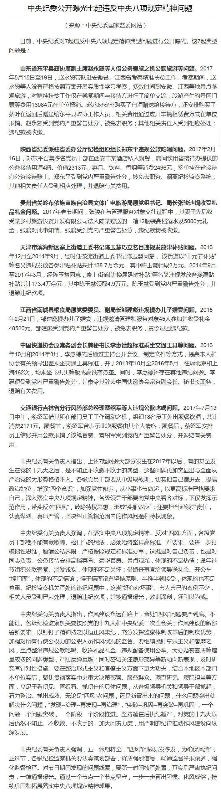 中央紀委公開曝光七起違反中央八項規(guī)定精神問題