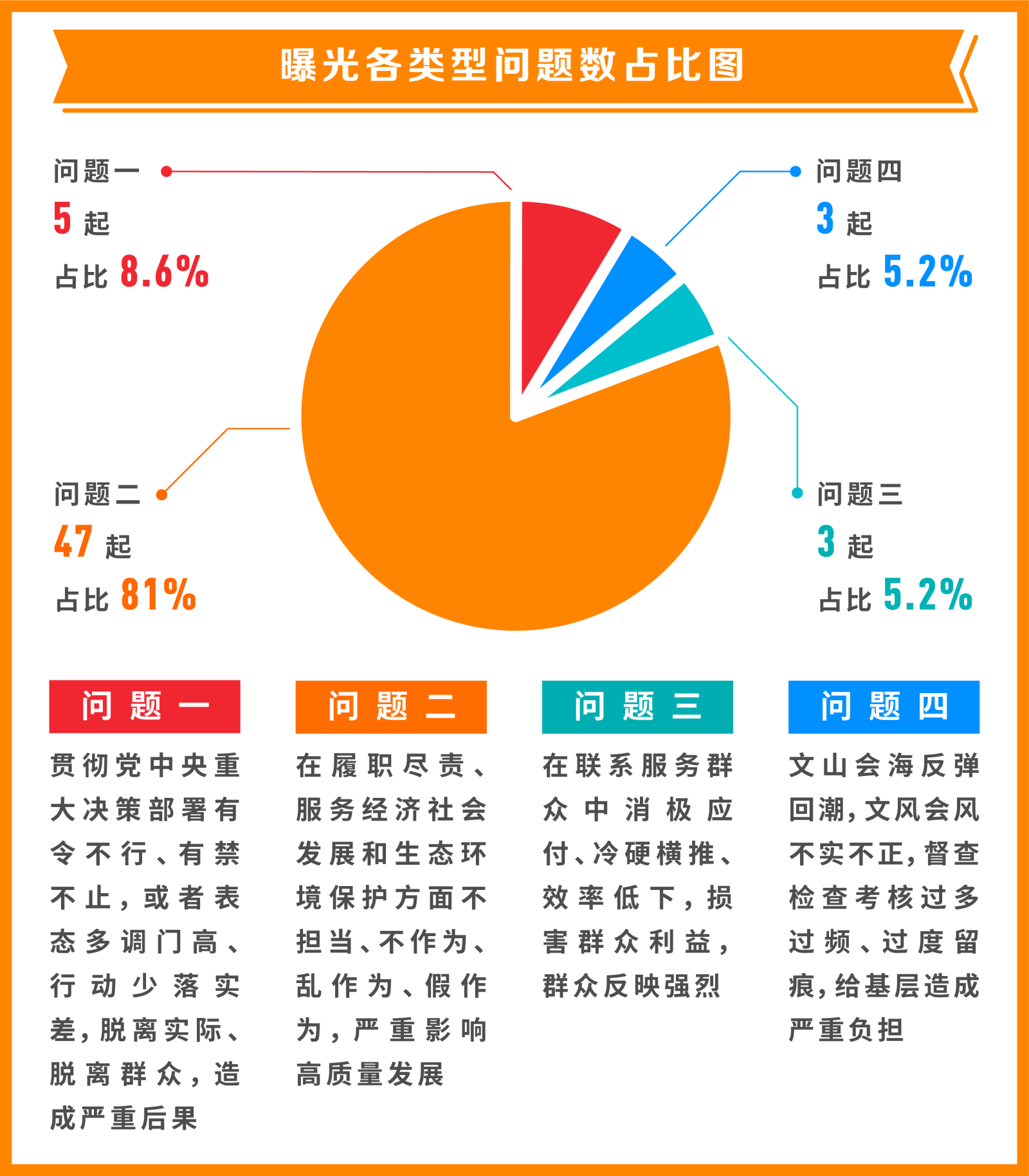從具體問題類型看,“貫徹黨中央重大決策部署有令不行、有禁不止,或者表態(tài)多調(diào)門高、行動少落實差,脫離實際、脫離群眾,造成嚴重后果”方面問題5起,占比8.6%;“在履職盡責、服務(wù)經(jīng)濟社會發(fā)展和生態(tài)環(huán)境保護方面不擔當、不作為、亂作為、假作為,嚴重影響高質(zhì)量發(fā)展”方面問題47起,占比81%;“在聯(lián)系服務(wù)群眾中消極應(yīng)付、冷硬橫推、效率低下,損害群眾利益,群眾反映強烈”方面問題3起,占比5.2%;“文山會海反彈回潮,文風會風不實不正,督查檢查考核過多過頻、過度留痕,給基層造成嚴重負擔”方面問題3起,占比5.2%。